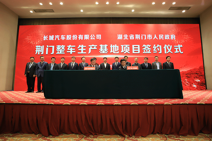 10月19日,长城汽车荆门整车生产基地项目签约仪式在湖北武汉举行。湖北省副省长曹广晶,荆门市市委副书记、市长孙兵,长城汽车董事长魏建军,长城实业有限公司董事长郝建军,以及湖北省各级领导、荆门市及高新区主要领导出席签约仪式。